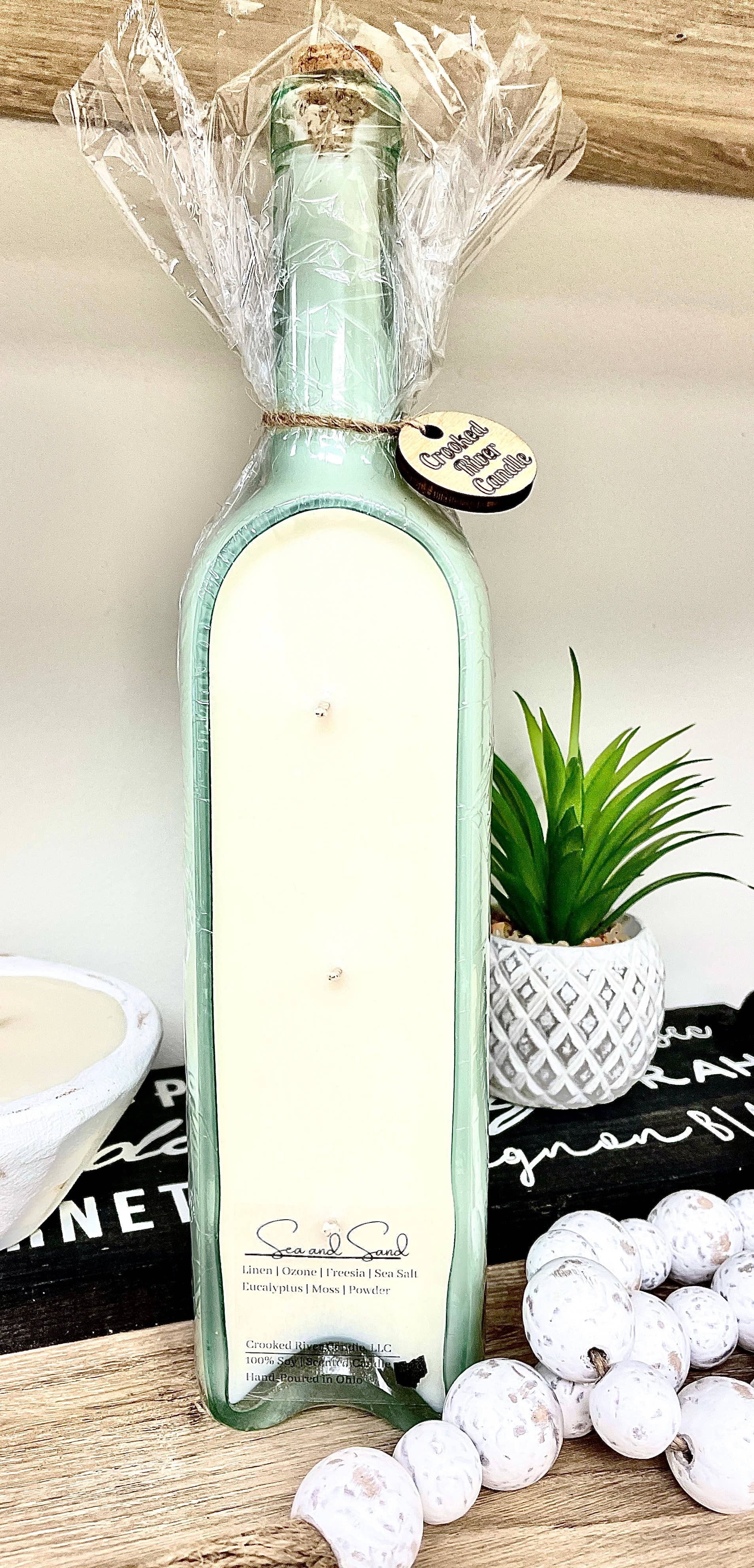Recycled glass wine bottles are filled with 18 ounces of our soy wax blend and a mix of premium fragrance and essential oils. Each candle has 3 all cotton, lead free, non-toxic wicks. Colors and shapes of the wine bottles may vary and cannot be selected. Colors are clear, light green, and dark green. When purchasing 2 or more we will try to give you some variety in color and shape. All of our Wine Bottle Candles come shrink wrapped for protection during shipping and sale and will also be adorned with a signature Crooked River Candle wooden circle. Candles can be displayed laying down or straight up. These will look great on your shelves!